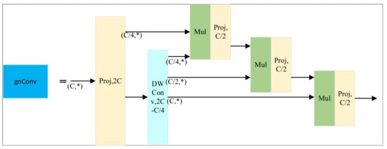 gnConv (gated non-local convolution) [] combines gated convolution and a recursive design to effectively capture the contextual relationship in image data to achieve high-order feature interactions. A schematic diagram of the gnConv structure is shown in Figure 4. The input of gnConv is a feature map with channel C, and after the first layer of convolution, the number of channels doubles. In parentheses, C represents the number of output channels, and the remaining information is represented by *. The convolutional output of the first layer is divided into two parts: the first part is used by the next layer, and the second part is fed into the deep separable convolution to output three parts as inputs for the other three layers. It enhances the feature representation without introducing additional computational complexity.