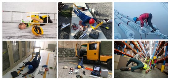 The person falling dataset is a crucial component for training, evaluating, and improving the fall detection model. It provides the model with learning material and validates and optimizes the model during the training process [,], enabling the fall detection model to better learn the features of the target. To solve the problem of limited scale and inability to cover various situations and changes in the current fall detection dataset in the field of substations, we comprehensively utilized an open source fall detection dataset (https://aistudio.baidu.com/aistudio/datasetdetail/94809, accessed on 25 November 2021) in Baidu AIStudio and self-made substation scene fall data. In the experiment, the data were expanded using methods such as horizontal flipping, random cropping, and angle rotation. There are a total of over 7000 datasets that cover various indoor and outdoor scenes, as shown in Figure 5; some typical fall scenarios are presented as references for evaluation of the performance of the model in real situations.