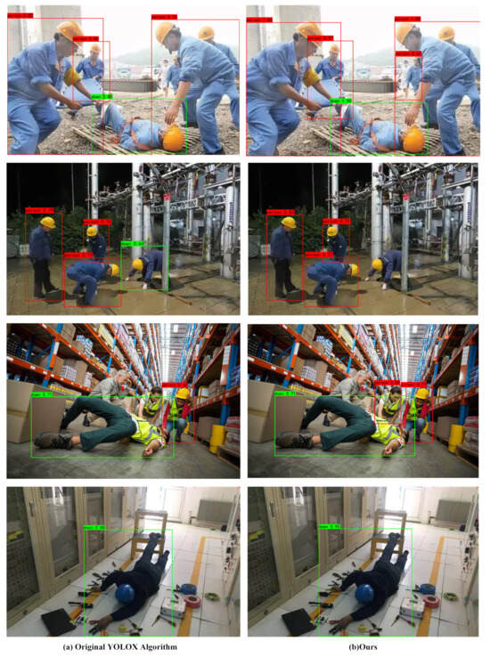 In this study, the detection performance of the original YOLOX model and that of the algorithm proposed in this paper were visually compared, as shown in Figure 7. The improved algorithm performs better than the baseline model, which addresses the issues of false negatives and false positives in the original algorithm. The benchmark model often fails to detect small target personnel, such as those located at a distance, mainly due to insufficient feature extraction of the target, insufficient attention to the target in complex backgrounds, and the inability to solve the problem of large differences in target scales among substation personnel. By improving the algorithm, the localization and feature extraction capabilities of multiscale targets in complex backgrounds can be enhanced, thereby generating more accurate detection frames and alleviating the situation of missed detections to a certain extent.