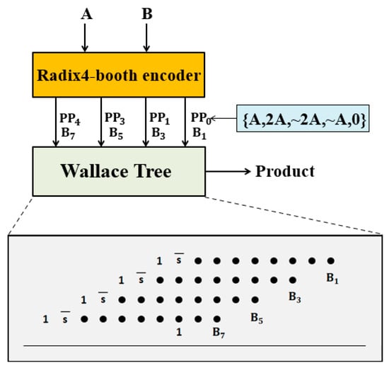 The structure of the 8 × 8 radix-4 Booth multiplier using the sign bit expansion method is shown in Figure 2. However, when this multiplier is directly implemented on FPGA, it will cause unnecessary waste of resources due to inherent architectural differences.