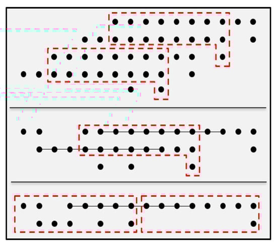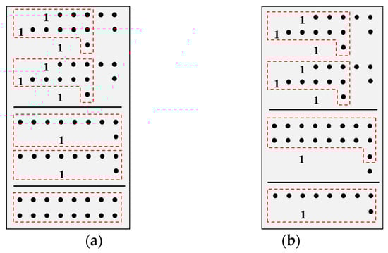 Specifically, suppose there are M multipliers in a convolutional process unit with the bit-width of 4. If calculating the result of each multiplier first, as shown in Figure 7a, then 3 × M − 1 carry chains are needed, where 2 × M are used for each multiplier, and the others are used for the final addition. However, if directly accumulating all partial products, there are only 2 × M carry chains, as shown in Figure 7b, which reduces M − 1 carry chains. Moreover, our proposed partial product reduction tree does not influence the parallelism, which only fulfills the idle ports of carry chains using other partial products. This operation does not change the logical levels of the circuit, that is, it neither increases the height of the partial product reduction tree nor the delay. In fact, the proposed method can not only reduce the resource utilization but also be effective for all multiply–accumulate structures without requirement for the input data order, different from the Systolic Array Architecture and Winograd Algorithm.
