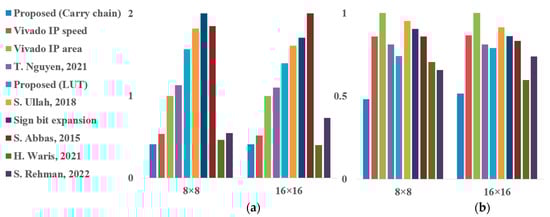 Comparison results of multipliers [17,22,23,24,25]: (a) Normalized performance metrics (LUT × PDP); (b) normalized LUT.