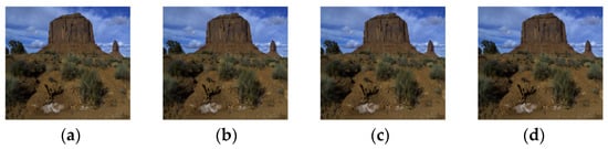 For the high-level application environment, we applied the multiply–accumulate structure to discrete cosine transform (DCT) in JPEG compression. For each 8 × 8 block, the DCT is employed as two matrix multiplications of sizes 8 × 8 and thus requires 1024 multiplications and 896 additions. As shown in Figure 9a, the input image with bit-width of 16 is from the MIT Adobe FiveK dataset. The peak signal-to-noise ratio (PSNR) and structural similarity index measure (SSIM) are used to evaluate the quality of the output images. Figure 9 and Table 5 indicate that even compared with the ones using approximate multipliers [17,25], our proposed structure can obviously reduce the LUT utilization without loss of accuracy.