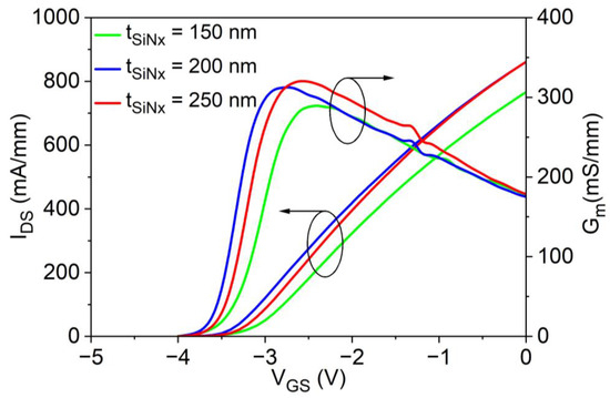 The DC characteristics of the 4 × 50 μm AlGaN/GaN HEMTs were measured using Keysight B1505A. Figure 3 shows the typical IDS-VGS and Gm-VGS characteristics at VDS = 20 V for 4 × 50 μm AlGaN/GaN HEMT devices with different SiNx thicknesses (150 nm, 200 nm, and 250 nm). While the SiNx thickness increases from 150 nm to 200 nm, the device exhibits an increase in the saturation drain current (IDSS) from 766.5 mA/mm to 861 mA/mm, and the maximum transconductance (Gm,max) increases from 290.1 mS/mm to 312.9 mS/mm. Increasing the SiNx thickness to 250 nm no longer significantly increases the IDSS and Gm,max of the device, as shown in Table 1. Compared to other thicknesses, the device with a SiNx thickness of 250 nm exhibits the highest IDSS and Gm,max. The increase in the device’s current and Gm is due to the increase in the thickness of the SiNx passivation layer, which leads to an increase in the biaxial tensile stress applied to the AlGaN layer, further increasing the surface charge density at the heterointerface [34,35]. Furthermore, the threshold voltage (Vth) for a 150 nm SiNx thickness is −3.1 V, whereas the Vth for SiNx thicknesses of both 200 nm and 250 nm is −3.7 V. The Vth is defined as the VGS when IDS = 1 mA/mm.