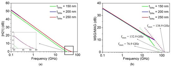 (a) |H21| and (b) MSG/MAG versus frequency for AlGaN/GaN HEMTs with different SiNx thicknesses.