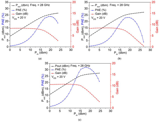 SiNx thicknesses of (a) 150 nm, (b) 200 nm, and (c) 250 nm for the 4 × 50 μm device’s power performance at 28 GHz.