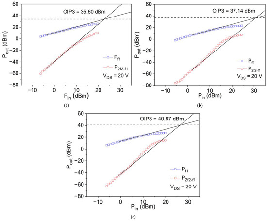 To evaluate the linearity of the devices, two-tone measurements were performed at 28 GHz with a 5 MHz tone spacing using the Keysight E8267D signal generator, N9030B spectrum analyzer, U84888A power sensor, N6700C modular power system, and an AMP4072 power amplifier. Figure 6 shows the two-tone measurement results at 28 GHz for 4 × 50 μm devices with different SiNx thicknesses. During the measurements, each device was measured at a bias of class AB (1/4 IDSS, IDSS = IDS at VGS = 0) and VDS = 20 V. The measurement results show that the OIP3 value improves from 35.60 dBm to 40.87 dBm when the SiNx thickness of the device is increased from 150 nm to 250 nm. Based on the previous polynomial curve fitting results, it can be observed that as the SiNx thickness increases, the ratios of / and / decrease, resulting in an improvement in the device’s linearity. Moreover, the increase in OIP3 could be attributed to the increase in SiNx thickness, which leads to a higher current and changes in the Gm distribution, thereby enhancing the linearity of the device.