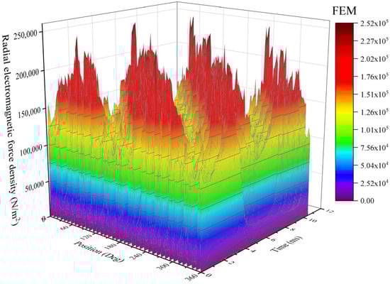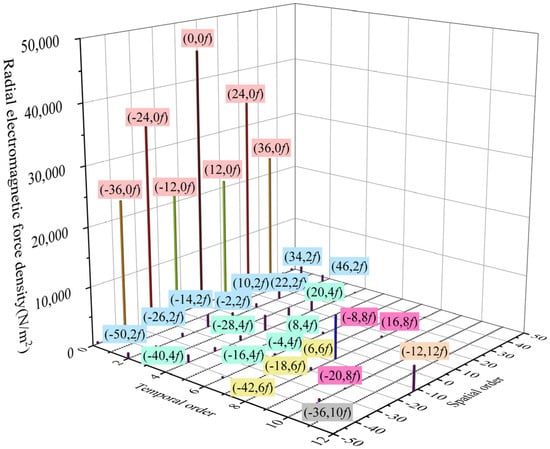 By expanding Equation (7), we can obtain the various components of radial electromagnetic force. Negative harmonic order in the radial electromagnetic force space indicates that the direction of radial electromagnetic force is opposite to the direction of machine rotation.