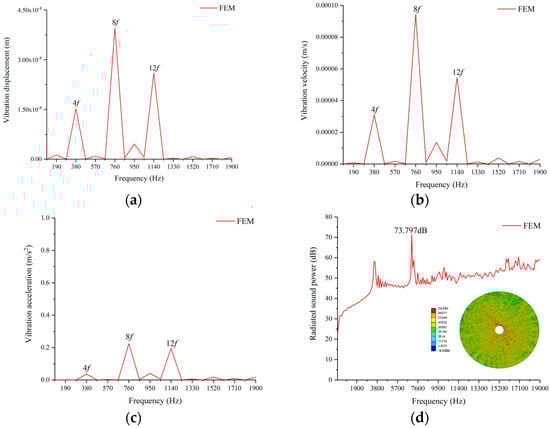 Figure 4 shows the vibration displacement, vibration velocity and vibration acceleration wave form of the PMVSM, which are mainly concentrated at 4f = 380 Hz, 8f = 760 Hz and 12f = 1140 Hz. Due to the low order and large amplitude of the radial electromagnetic force harmonic components of 4f = 380 Hz, 8f = 760 Hz and 12f = 1140 Hz, the harmonic content of the vibration displacement, vibration velocity and vibration acceleration at the corresponding frequency increases. The maximum noise of the PMVSM at rated speed is 73.797 dB, and the maximum noise point occurs in the high-frequency region.