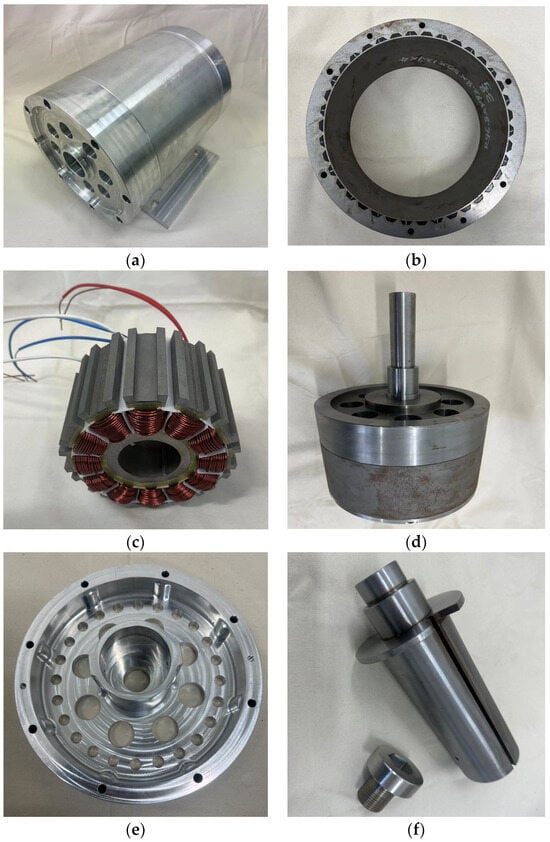 The main components of PMVSM: (a) the chassis of PMVSM; (b) the rotor core of PMVSM; (c) the stator of PMVSM; (d) the rotor integration of PMVSM; (e) the stator end cover; (f) the stator fixed shaft and fastening screws.