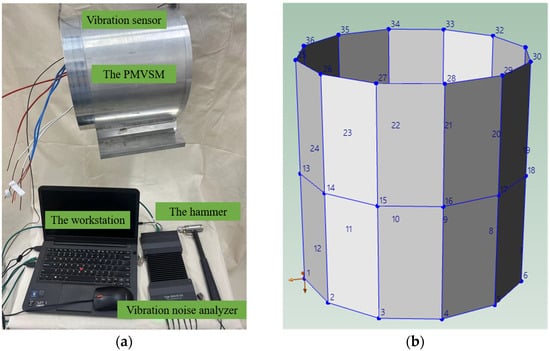 We used the hammer method to conduct modal experiments on the prototype PMVSM. The force hammer strikes the PMVSM to vibrate, inputting an excitation signal at each specific position. The response signal is collected by the machine, allowing the sensor to obtain the machine modal vibration mode and natural frequencies. The PMVSM casing is divided into 36 areas (vibration point) in both the axial and radial directions, and a hammer is used to evenly strike each area three times to obtain the natural frequency and modal shape of the machine. The vibration points need to be evenly distributed on the surface of the casing, and there should be as many as possible to ensure the accuracy of the measurement. Figure 7b shows the internal software of the measurement system. The model only displays the distribution of the vibration points on the surface of the casing and does not represent the specific structure of the measured object. The modal test platform is shown in Figure 7.