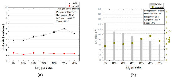 Dependence of SF6 gas ratio on (a) the etch rates of p-GaN and Al0.2Ga0.8N, and (b) the DC-bias voltage measured during the etching process and the resulting selectivity.