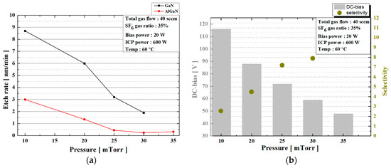 Dependence of chamber pressure on (a) the etch rates of p-GaN and Al0.2Ga0.8N, and (b) the DC-bias voltage measured during the etching process and the resulting selectivity.