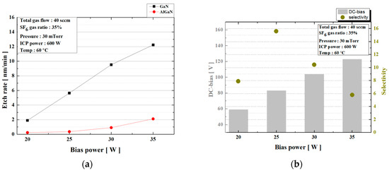 Dependence of bias power on (a) the etch rates of p-GaN and Al0.2Ga0.8N, and (b) the DC-bias voltage measured during the etching process and the resulting selectivity.
