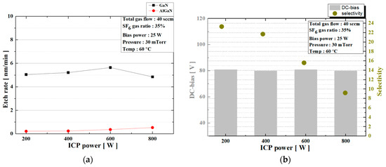 Dependence of ICP power on (a) the etch rates of p-GaN and Al0.2Ga0.8N, and (b) the DC-bias voltage measured during the etching process and the resulting selectivity.