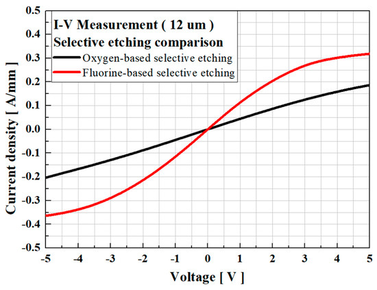 Secondly, the current–voltage (I–V) characteristics were also measured between two ohmic electrodes placed at a distance of 12 μm from each other. As illustrated in Figure 5, the sample that was fabricated using the fluorine-based selective etching process exhibited a significantly higher current density when compared to the sample prepared using the oxygen-based process. Since the thickness of the AlGaN barrier layer remains consistent after the selective etching process in both samples, it is suggested that the superior I–V characteristics are associated with reduced surface damage.