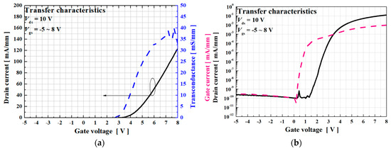 Figure 8 shows the measured transfer I–V characteristics of the E-mode p-GaN gated AlGaN/GaN HFET that was fabricated using the optimum fluorine-based selective etching process. These measurements were taken at a fixed drain voltage (Vds) of 10 V. The device demonstrated notable performance metrics, including a threshold voltage of 3.5 V and an impressive on/off ratio of >109, achieved at a gate-source voltage (Vgs) of 8 V. Moreover, the off-state drain leakage current was remarkably low, measuring approximately 10−10 A/mm.