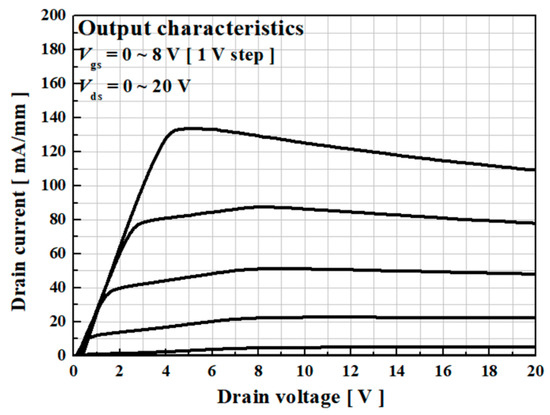 Output I–V characteristics of a fabricated E-mode p-GaN gated AlGaN/GaN HFET. The gate voltage step was 1 V.