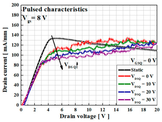 In order to investigate the trapping effects, a series of pulse measurements were carried out. These pulse measurements employed a precisely controlled pulse width of 1 μs and a repetition period of 1 ms. Figure 10 shows the pulsed I–V characteristics measured at various quiescent drain bias voltages with a constant quiescent gate bias voltage of 0 V. It is noteworthy that, during these experiments, no significant current collapse was observed within the linear region of operation, indicating stable and reliable device performance under these conditions.