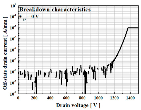 The off-state breakdown characteristics were measured at a gate voltage (Vgs) of 0 V using the Keysight B1505A system. As shown in Figure 11, there was no breakdown phenomenon observed, even when subjecting the device to voltages as high as Vds = 1000 V. Furthermore, the catastrophic breakdown voltage was found to exceed Vds = 1350 V. The observed noisy leakage current level below Vds = 1000 V is attributed to the resolution limitations of the equipment during high-voltage measurements. These extensive device characteristics underscore the promising performance exhibited by the fabricated E-mode p-GaN gated AlGaN/GaN HFET, encompassing attributes such as a high threshold voltage, exceptional on/off ratio, minimal leakage current, low on-resistance, and robust off-state breakdown characteristics. It is suggested that the fluorine-based etching process optimized in this study is a promising technique that can be utilized in the fabrication of E-mode p-GaN gated AlGaN/GaN HFETs.