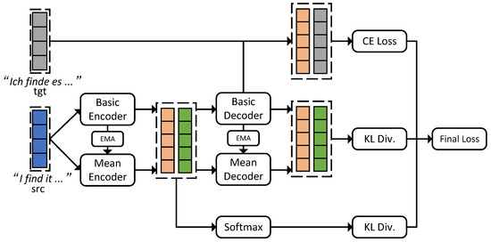 We input the given input x with different perturbations to the basic model and the mean model, denoted as and , respectively, the feature outputs of the encoders of the two models are denoted as and , respectively, and the predicted outputs of the decoder are denoted as and . Then, and are transformed into probability distributions and by the softmax layer, respectively. For the similar input, the model encoder and decoder should have consistent outputs. Algorithm 1 illustrates the entire training process. We used the KL divergence [20] to measure the distance between the encoder output and decoder output distributions of the two models and define the consistency loss: