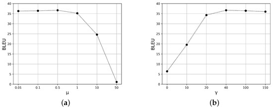 BLEU scores with different and different on the validation set of IWSLT’14 De-En dataset. (a) BLEU scores with different and fixed ( = 40). (b) BLEU scores with different and fixed ( = 0.5).