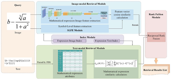 Regarding mathematical expression retrieval of the text modal, expression trees are widely used for storing and processing mathematical expressions and have been applied to mathematical expression retrieval by many scholars. Goel et al. [6] have undertaken studies on Math Word Problems, utilizing a tree-matching algorithm for the matching of mathematical expressions; they performed pair-wise matching on expression trees through post-order traversal. Pfahler et al. [7] incorporated unsupervised embedding learning and Graph Convolutional Neural Networks (GCNNs) for learning mathematical representations. In order to facilitate effective nearest-neighbor queries, mathematical operations represented in XML format were processed as graphical data and embedded into a low-dimensional vector space. Schellenberg et al. [8] employed substitution trees to index and retrieve mathematical expressions in LaTeX representation, but the insertion bias limits its performance. Hu et al. [9] proposed WikiMirs, using a method of generalization that is hierarchical to produce subtrees from the representation trees of mathematical expressions, which can support substructure and similarity matching of mathematical expressions. Zhong et al. [10] presented a dynamic pruning algorithm for inverted index, representing mathematical expressions as OPTs (Operator Trees), which improves retrieval efficiency for substructures of mathematical expressions.