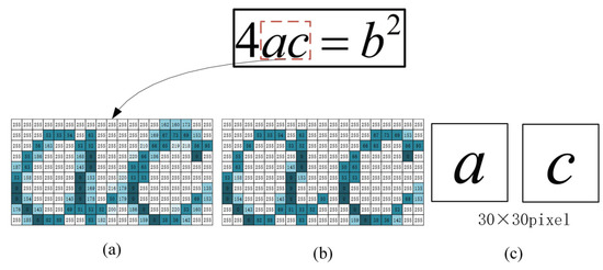 Figure 3a shows attached symbols “a” and “c”, which are separated using the connected component labeling algorithm (Figure 3b). Each resulting component forms an element symbol block of pixels. Position vectors of the element symbol block are computed for the symbol block set S, where represents the position vector for the j-th element symbol block (Figure 4).