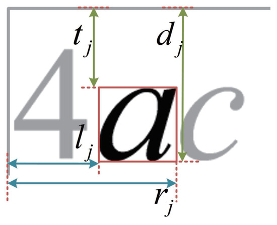 Here , , , and represent the distance between the top, down, left, and right edges of the j-th element symbol block and the top and left edges of the query image . The position vector elements are standardized to range between 0 and 1 using Equation (1), where , , are the height-to-width ratio of , for recording the size proportion of the expression.
