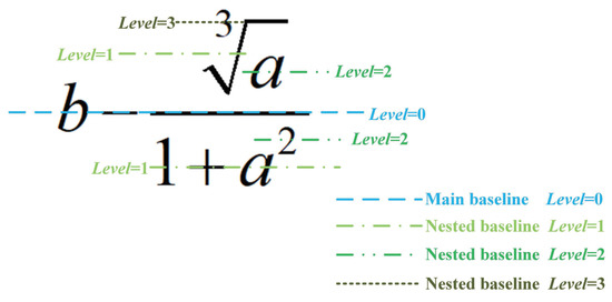 The meaning of each attribute value is as follows: (1) denotes the sequence number of in the expression. (2) represents the horizontal baseline position of the symbol in the expression, as shown in Figure 5. (3) is the function code of , indicating whether the current symbol is an operator () or an operand (). (4) is the spatial flag information of , which shows how the present symbol and the prior symbol are related. can take values from 1 to 8, representing “above”, “superscript”, “right”, “subscript”, “below”, “contains”, “left-superscript”, and “left-subscript”. The main baseline’s symbols have .