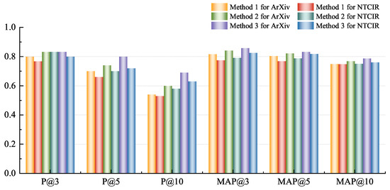 The average P@k and MAP@k of the three methods are summarized in Figure 7. Text-modal retrieval outperformed image-modal retrieval because FDS is more concerned with the type of the symbol itself (e.g., whether the symbol is an operator, operand, constant, or variable). However, we found that within the results of image modality retrieval, expressions more structurally similar to the query image are ranked higher. This suggests that image modality retrieval methods are more adept at capturing structural information inherent in expressions. The integration of both modalities can lead to more accurate and effective retrieval results. The image-text modal RRF method was effective, as the fusion ranking of two modal retrieval results was better than the single modal retrieval ranking, demonstrating the complementary results of the two modal retrievals.
