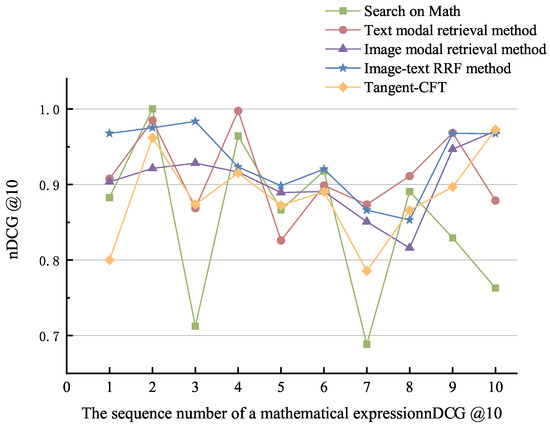 SearchOnMath [33] is a retrieval tool for scientific literature and Wikipedia pages based on mathematical expressions. Tangent-CFT [34] is a mathematical expression embedding model that represents mathematical expressions using Operator trees (OPTs) and Symbol Layout Trees (SLT) and ultimately generates formula embeddings using fastText. Experimental trials were conducted utilizing the mathematical expressions from Table 5. A comparative analysis was performed between our proposed approach and other methods. The results for MAP@k and average P@k are presented in Table 8. The proposed image-text modal RRF method achieves an accuracy of 0.660 and an average precision of 0.774 for the top 10 results. The nDCG@10 results for each expression retrieval outcome under various methods are depicted in Figure 8.