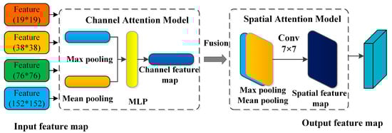 Channel attention is concerned with the relationship between individual channels of features, whereas spatial attention is concerned with the relationship between individual pixels within the feature map channels. In the backbone network, to extract effective images and features, we designed the channel attention module and spatial attention module as the attention mechanism CBAM introduced into Yolov5 to improve the feature extraction capability and detection speed of the network-trained model. The specific model structure is shown in Figure 3.