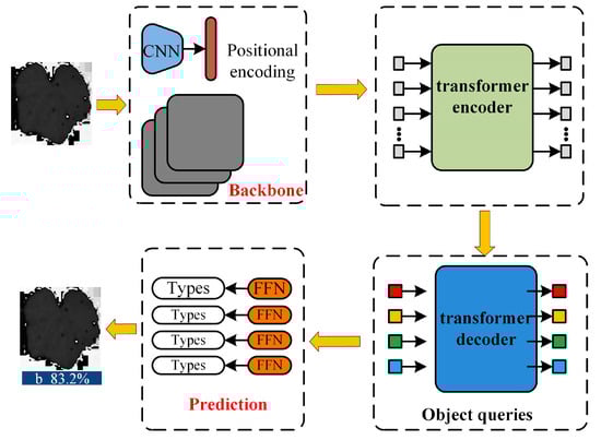During the encoding stage of the transformer-based model, the attention matrix size is . The attention matrix in DETF maps to two different points in the feature block represented by each token. Both the number of input tokens in the encoder and the feature image elements define a frame, giving the DETF model unique advantages for target detection tasks. In addition, the presence of pests and diseases disrupts the product surface texture continuity. A DETF model with strong global feature learning capability can likewise tap into richer surface texture features. Hence, pest and disease detection is easily implemented.