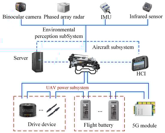 As shown in Figure 5, the proposed UAV system consists of a human–computer interaction handle (HCID), server, 5G module, PS, EPS, and AS. PS comprises four flight batteries, four motors, and eight propellers. EPS includes a binocular camera, phased array radar, inertial measurement unit (IMU), and infrared sensor.