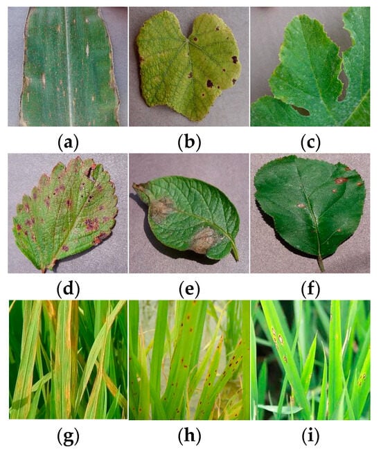 Sample images of the experimental data set. (a) Leaf spot of maize; (b) Grape leaf blight; (c) Powdery mildew; (d) Strawberry leaf disease; (e) Potato late blight; (f) Apple black rot; (g) Bacterial leaf blight; (h) Brown spot; (i) Leaf smut.