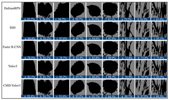 The performance of the algorithms was further tested based on the test set for the comparative algorithms (i.e., DaSiamRPN, SSD, Faster R-CNN, and Yolov5), and the corresponding pests were numbered according to Figure 7.