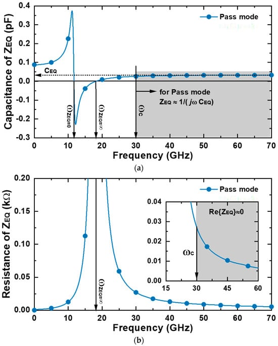 Here, and denote frequencies at which ZEQ becomes 0 and infinity, respectively. Figure 2 shows the simulation results of the resistance and capacitance of ZEQ according to frequency. Since the simulation was performed using models of actual devices, there is a slight difference from the results of the analyzed equations, but the tendency is the same as that of the equations. The main difference between equations and simulation is that parasitic resistances were ignored in equations, but were considered in simulation.