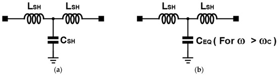 Therefore, in the case of pass-mode, a circuit consisting of CSH, CM, and LRE may be represented by CEQ in the frequency region higher than ωC. This allows an equivalent circuit in pass mode to be T-type LSH-CEQ-LSH, similar to shift mode, in frequency regions higher than ωC. Figure 3 shows equivalent circuits of shift and pass modes in frequency regions higher than ωC.