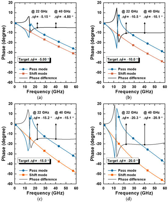 In this study, the 65 nm RFCMOS process which provides eight metal layers was used to design the phase shifter. The schematics for the simulation results of Figure 5 are all the same as Figure 1a. The device values used for each bit to obtain the phase shift of 5°, 10°, 15°, and 20° shown in Figure 5 are summarized in Table 1. When designing for each bit to obtain simulation results, the effects of metal lines, inductors, and test pads were all considered through electromagnetic (EM) simulation to secure the accuracy of the simulation results. Spiral inductors are designed using the top metal layer to minimize loss due to the Silicon substrate. In addition, the gate voltages of the transistor were 1 V and 0 V, respectively, for the on and off states of the transistor. The simulation results in Figure 5 were conducted at a temperature of 25 °C in a typical corner.