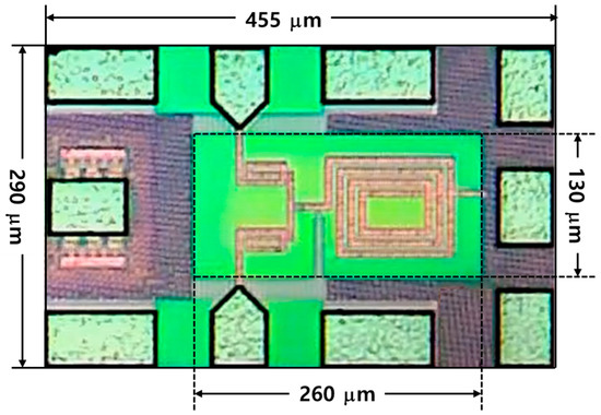 In order to verify the effectiveness of the proposed design methodology through measurement, a phase shifter of the unit bit of the T-type L-C-L structure was designed using the 65-nm RFCMOS process. The phase shift target of the designed unit bit was set to 20°. For shift- and pass-modes, the gate voltages of the transistor were 1 V and 0 V, respectively. The measurement was carried out at room temperature. Figure 6 shows a chip photograph of the designed 20°-bit phase shifter. The chip and core sizes are 0.290 × 0.455 mm2 and 0.130 × 0.260 mm2. The designed phase shifter of the unit bit is actually integrated and used in the transceiver for the beamforming system. Therefore, although test pads were implemented in this study to verify the feasibility of the phase shifter itself, these test pads are removed when applied to the actual transceiver. On-wafer probes were used to measure RF input and output signals, and gate voltage was applied through a bonding wire.