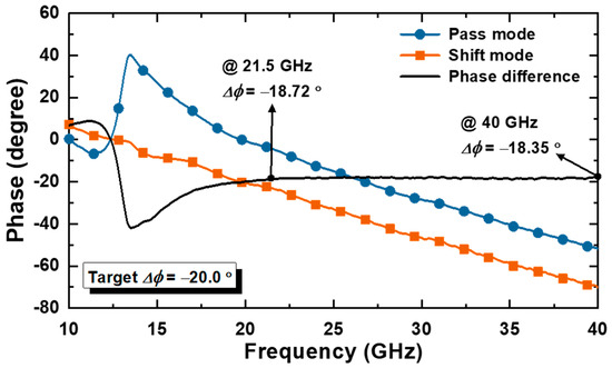 Figure 5d shows the simulated phase characteristics according to the frequency of the designed unit bit phase shifter, and Figure 7 shows the measured phase characteristics. Due to the limitation of the measurement environment, the operating frequency of the designed unit bit phase shifter was measured up to 40 GHz. The target phase was 20°, but the measured phase was slightly reduced. One of the causes of the difference between measurement and simulation results may be the accuracy of EM simulation. In addition, as described in the previous section, process–voltage–temperature (PVT) variation can also be one of the important causes of the difference.