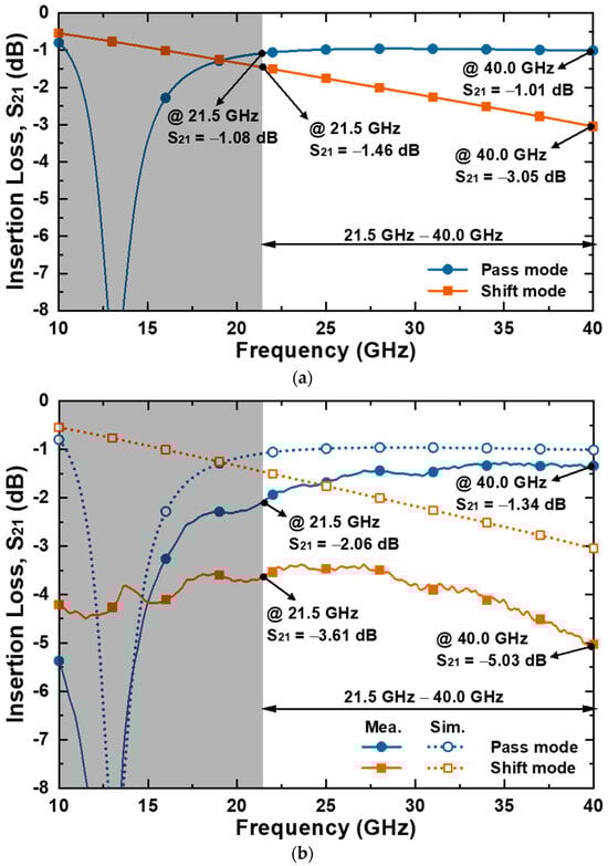 The measured phase differences of the shift and pass modes were 18.72° and 18.35° at 21.5 GHz and 40.0 GHz, respectively. In the operating frequency range of 21.5 GHz to 40.0 GHz, the measured phase difference was in the range of 17.85° to 18.72°. Therefore, based on the target phase difference of 20°, the phase error was less than 2.15°. However, considering the wideband characteristics of the proposed designed technique, the deviation of the phase difference in the operating frequency range from 21.5 GHz to 40.0 GHz was less than ±0.5°. Figure 8 shows the measured and simulated insertion losses of the designed unit bit phase shifter.
