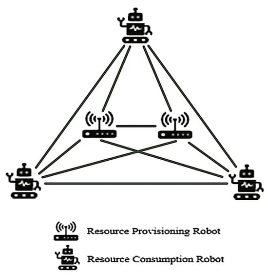 Game theory is a theory that studies the rational choices made by multiple decision-makers in competitive or cooperative situations [13], can model the strategic interactions between individuals and find Nash equilibrium solutions, and has been widely used to solve resource optimization problems [14,15]. In this paper, the resource allocation problem of swarm robots is abstracted as a two-stage autonomous swarm robot resource allocation game model. This model contains both a Cournot game and a price game. The autonomous swarm robots in the model are composed of two categories of robots. Namely, there are resource-providing robots that supply resources, and there are resource-consuming robots that demand resources. By dividing the swarm robots into these two types, the game model can analyze the dynamic resource interactions between robots needing to share limited resources. The resource-providing robot is the producer of the whole game model, providing computational resources for the resource-consuming robots; the resource-consuming robot can be regarded as the consumer of the whole game model, purchasing and consuming computational resources. In the first stage of the game, the resource-providing robots play the Cournot game, in which they simultaneously determine their respective production of computing resources according to the market demand. By maximizing their respective revenues, the resource-providing robots play a game among themselves to arrive at the optimal production level. Subsequently, the resource-providing and -consuming robots engage in a price game to determine resource allocation. In this second phase, the robots play the price game to allocate resources based on the production set in the first stage. In addition, the resource-providing robots share the local resource demand information among themselves to realize the synergy on the supply side. In the game process, the pricing objective of the provider is to maximize the revenue, and the purchasing objective of the consumer is also to maximize the revenue. In the advancement of the game, each robot makes rational decisions in accordance with the revenue maximization objective [16]. This scheme flexibly adapts to the dynamic changes in the emergency environment and optimizes resource allocation.