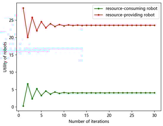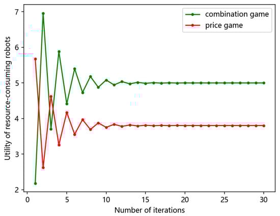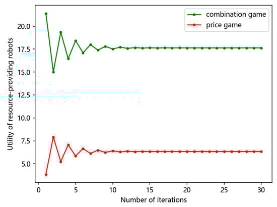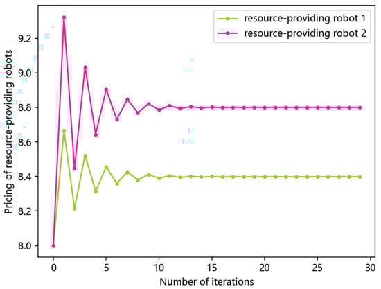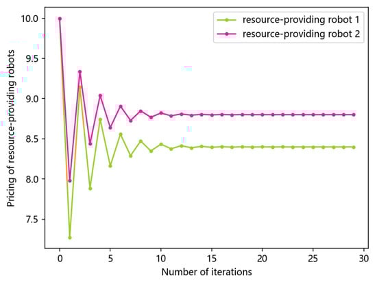 Figure 3 displays the pricing change process with the number of iterations for resource-providing robot 1 and resource-providing robot 2 when the initial pricing is set at 10. The robots adjust their pricing strategies based on the possible pricing strategies of each other. With increasing iterations, the participants progressively approach the optimal response strategy under rational expectations. Eventually, when resource-providing robot 1 is priced at around 8.4, and resource-providing robot 2 is priced at around 8.8, the pricing of both robots converges and reaches the Nash equilibrium state. At this point, the revenue of both parties is maximized. This equilibrium represents the optimal pricing combination that maximizes the revenue of both parties, and any unilateral change in the pricing strategy of either participant will lead to a decrease in their own utility. Although the strategies of the participants are dynamically adjusted during the game process, Figure 3 demonstrates that ultimately, the game mechanism drives both parties’ strategies to a stable state. This process confirms that the designed combination game model successfully promotes the convergence of participants’ strategies to the Nash equilibrium stabilization point.