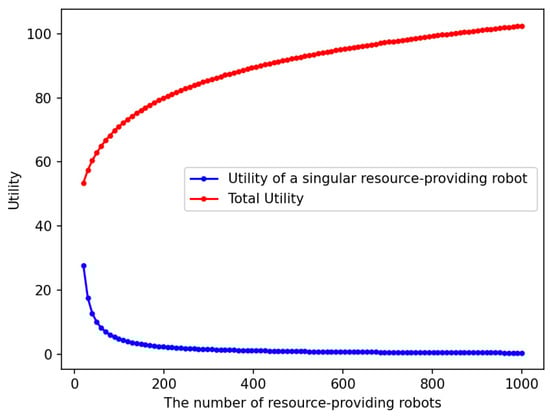 Utility of resource-providing robots with different numbers of resource-providing robots.