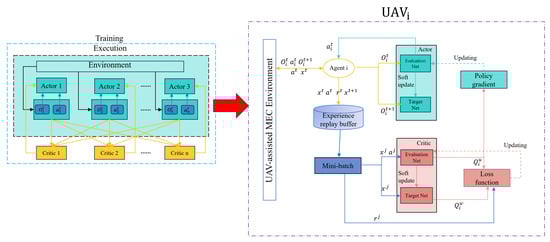 We employ the multi-agent deep reinforcement learning algorithm MADDPG to collaboratively optimize the objective function defined in Equation (19). As depicted in Figure 2, this algorithm integrates the deep deterministic policy gradient (DDPG) within a cooperative multi-agent learning framework, where each agent receives the same immediate reward. The MADDPG is built upon the actor–critic framework, leveraging both centralized training and decentralized execution.