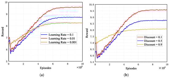 Algorithm 1 summarizes the detailed flow of the MADDPG algorithm for UAV-assisted MEC environment proposed in this paper. First, we randomly initialize the agent’s networks (lines 1–2) and initialize our replay buffer memory (line 3). The agents in the environment obtain the initial state of the observation, and the agent selects the task offloading percentage of UAVs within the communication range according to its policy and exploration noise (line 8). We employ Gaussian noise to enhance the action detection strategy, where represents the Gaussian noise. After the agent performs the selected action, the agent obtains a step reward, the next observation (lines 9–10). Then, the transition experiences of each agent are stored in the replay buffer memory, and the scenario state is updated to the next state (lines 11–12). The critic and actor network parameters of each agent are updated based on Equations (30) and (29), respectively (lines 16–17). Then, the target network parameters for each agent are updated according to Equation (32). The algorithm is terminated when it reaches the defined maximum number of sets.