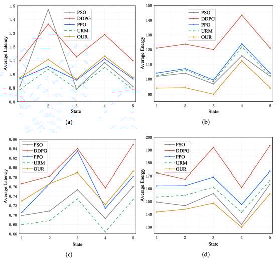 Figure 5 shows the comparative effect of our algorithm and the baseline algorithm for only five random states. To evaluate the real effectiveness of the algorithms in practical environments, we expanded the initial five random states to a total of 1000 random states. Employing the same methodology as described above, we collected offloading strategies from various schemes across different states. Subsequently, we computed the average energy consumption and average latency associated with these offloading strategies for task execution. It is worth noting that we only calculate the sum of the average energy consumption when all algorithms meet the latency constraints, as there may be cases of violation.