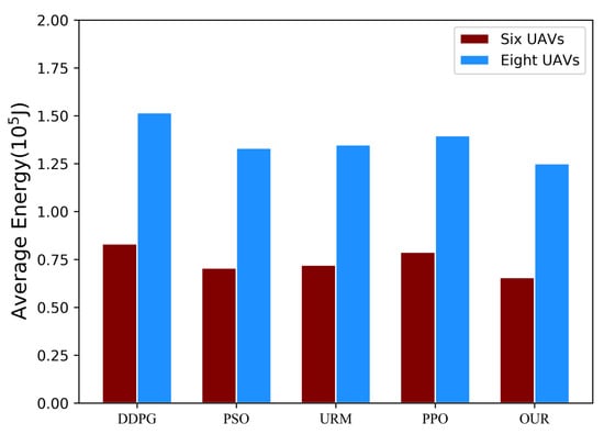 In environments featuring six and eight UAVs, the DDPG baseline algorithm breached latency constraints 187 and 3 times, respectively. The PSO baseline algorithm exceeded these constraints 233 and 90 times in the corresponding scenarios, while the PPO baseline algorithm did so 3 and 16 times in the same contexts. Notably, neither the MADDPG algorithm nor the URM algorithm violated the latency constraint. Figure 6 displays the total average energy consumption of the five algorithms across 1000 random states, where all algorithms successfully adhere to the latency constraints. The results indicate that our scheme, employing the MADDPG algorithm, achieves lower average energy consumption in comparison to the benchmark algorithm. For instance, with , the offloading scheme offered by MADDPG exhibits an average energy consumption that is 21.06% lower than that of DDPG, 16.72% lower than that of PPO, 8.93% lower than that of URM, and 6.99% lower than that of PSO.